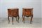 Coppia di comodini di forma mossa lastronati in radica di noce ad un cassetto...