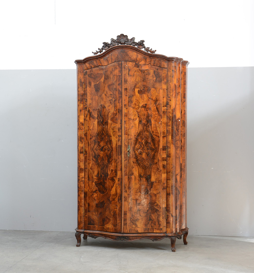 Armadio a due ante di forma sagomata in radica di noce e filettato in legno...