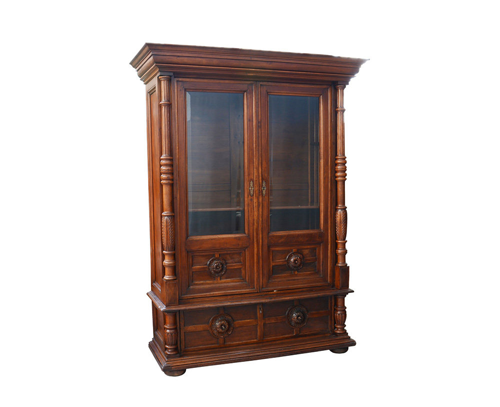 Armadio libreria con struttura architettonica in legno e decori ad intaglio. Parte superiore a due battenti con ante a vetri, parte inferiore con grande cassetto. Montanti a colonna e piedi a cipolla. Inizio sec. XX (cm 163x220x66)(lievi difetti)