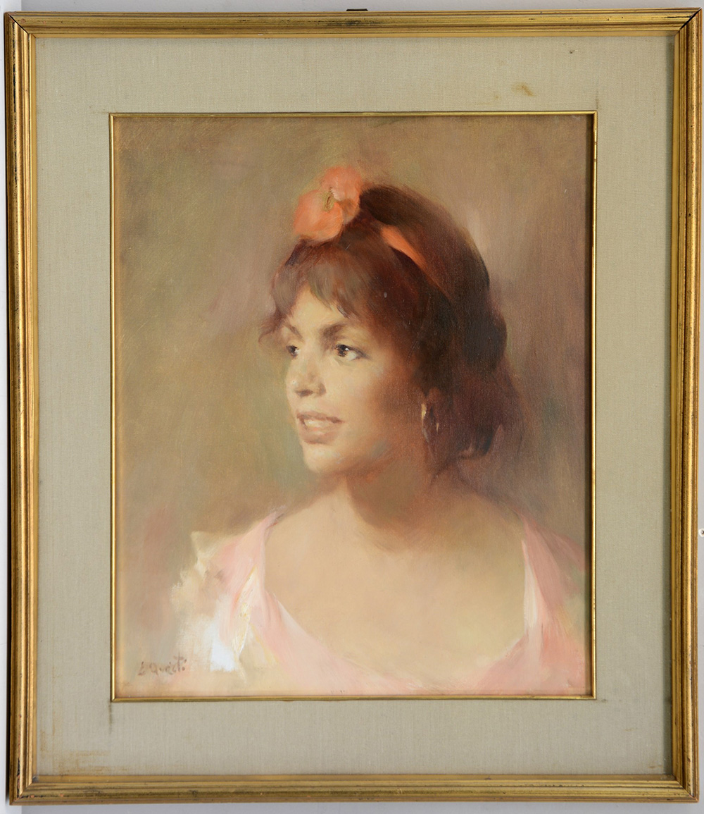 Ernesto Quarti Marchio (Bergamo 1907 - Bergamo 1982) "Ritratto di giovane con fiocco rosa" olio su tela firmato in basso a sinistra In cornice