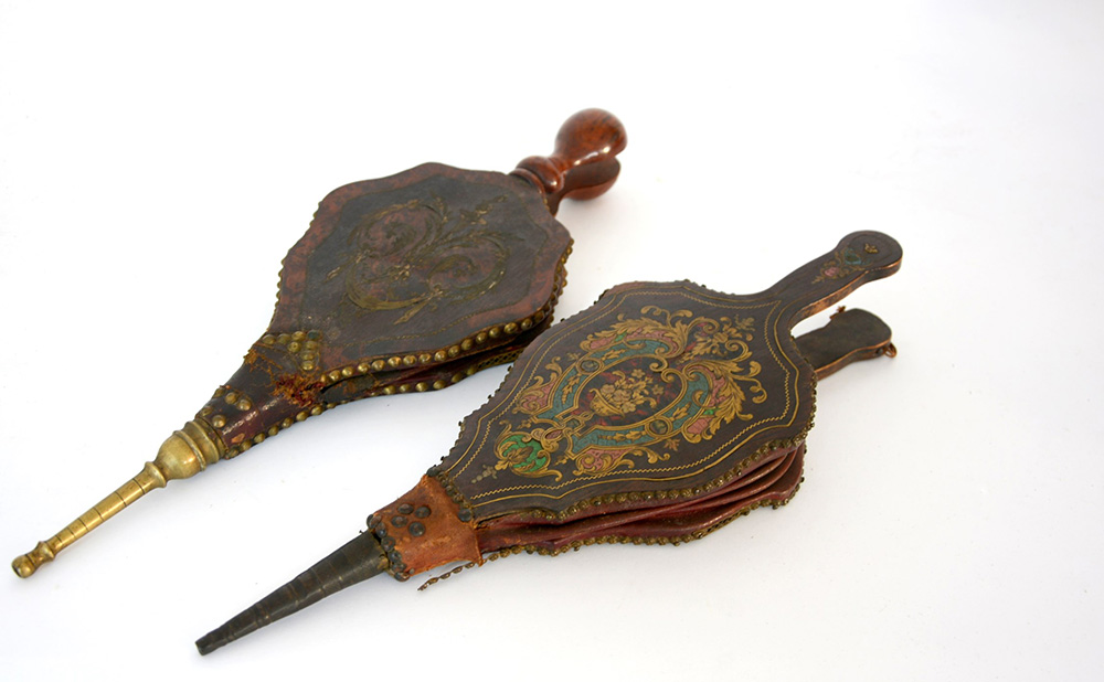 Lotto composto da due mantici del sec. XIX intarsiati in ottone e finta tartaruga a volute (difetti)
