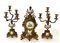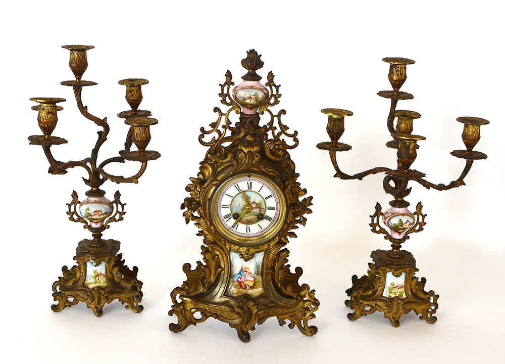 ANONIMO Trittico da camino in bronzo decorato con placche in porcellana policroma a paesaggi e scene galanti composto da pendola e due candelieri. Pendola con movimento a carica settimanale, suoneria delle ore e delle mezze su campanello, sospensione brocot, quadrante con cifre romane (pendola h cm 47 circa)
