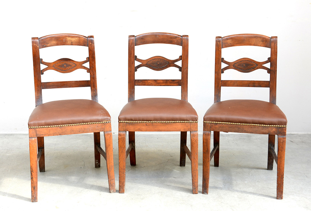 Gruppo di tre sedie con seduta rivestita in cuoio e schienale a giorno. Gambe a sciabola (difetti)