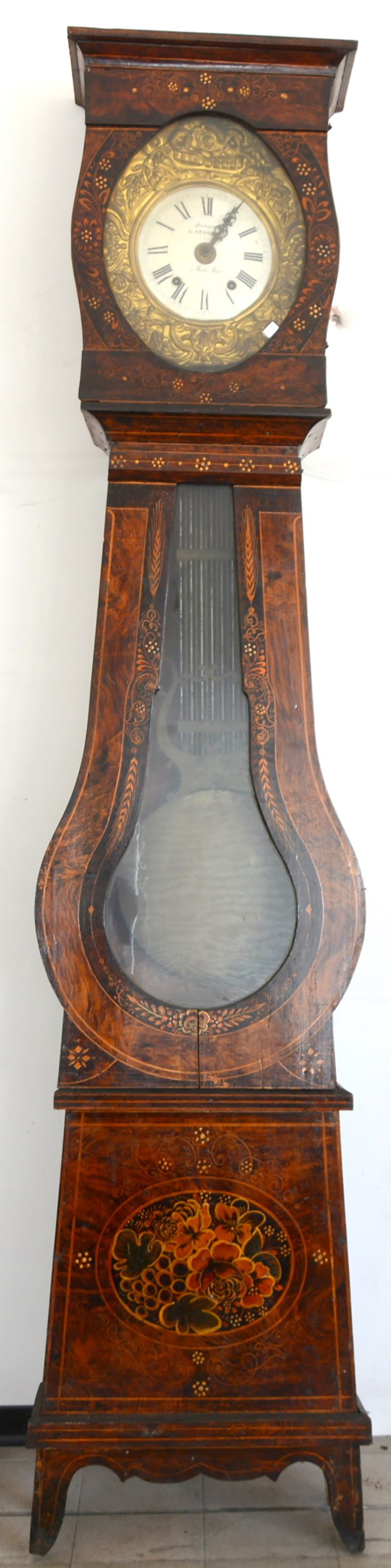 OROLOGERIA BERGALLO Pendola in legno di forma sagomata, movimento con carica settimanale, scappamento ad ancora, suoneria delle ore e delle mezze con botta e ribotta su campanello, pendolo lungo. Quadrante in smalto bianco con cifre romane (h. cm 227)