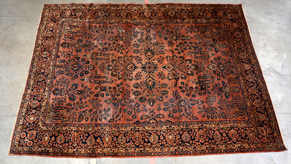 Tappeto Sarouk, Persia fine secolo XIX. Disegno floreale nei toni del blu, beige e rosso su fondo salmone (cm 358x274) (difetti)