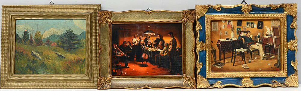 Lotto composto da tre dipinti su tavoletta raffiguranti un paesaggio e due interni con figure (cm 18x24 circa), in cornici (difetti)