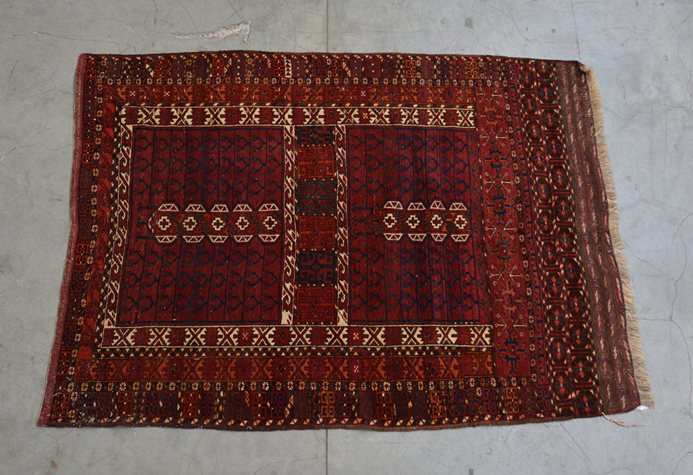 Tappeto Ensi Yomut, Turkestan occidentale fine secolo XIX. Disegno Ensi a due riquadri nei toni del rosso, blu e marrone (cm 184x139) (difetti)