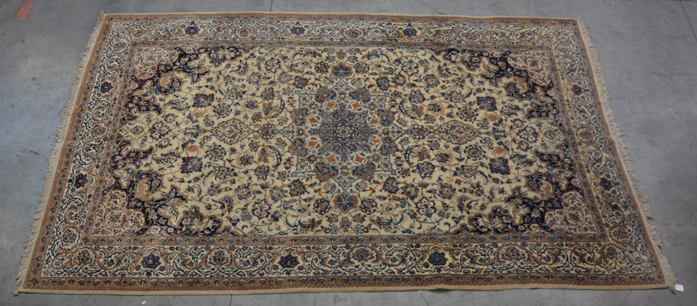 Tappeto Nain, Persia secolo XX. Lana e seta. Disegno a medaglione rosso su campu blu e azzurro (370x223) (difetti)