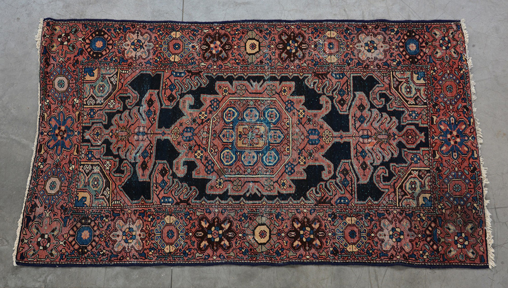 Tappeto Sarouk, Persia inizio secolo XX. Disegno a medaglione rosa su fondo blu (cm 198x119) (difetti)