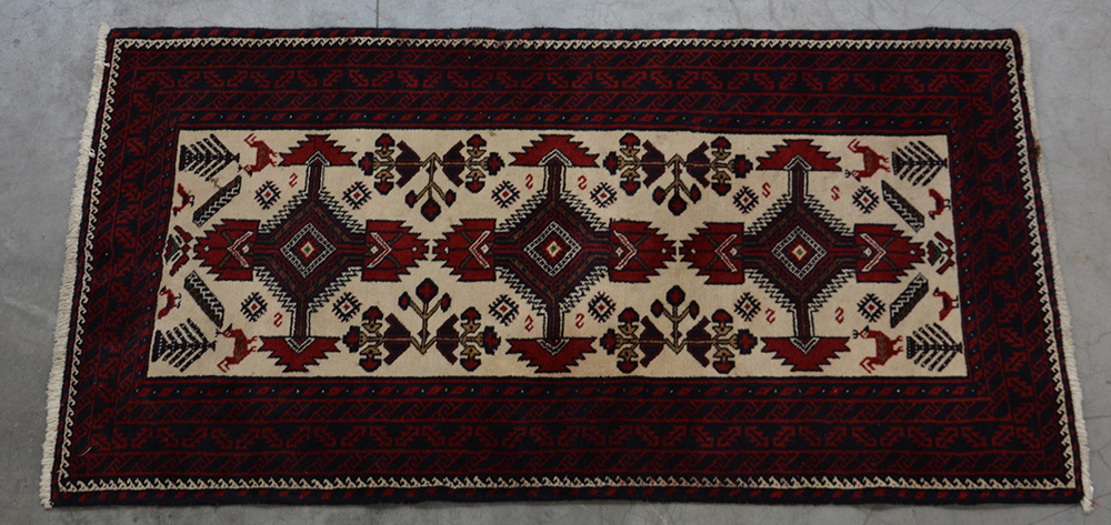 Tappeto Kyzil-Ayak, Turkestan occidentale secolo XX. Disegno geometrico nei toni del rosso e nero su fondo bianco (203x106) (difetti)