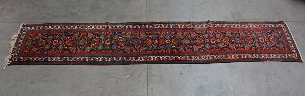 Passatoia Malayer, Persia secolo XX. Disegno Herati policromo su fondo blu (cm 510x103) (difetti)