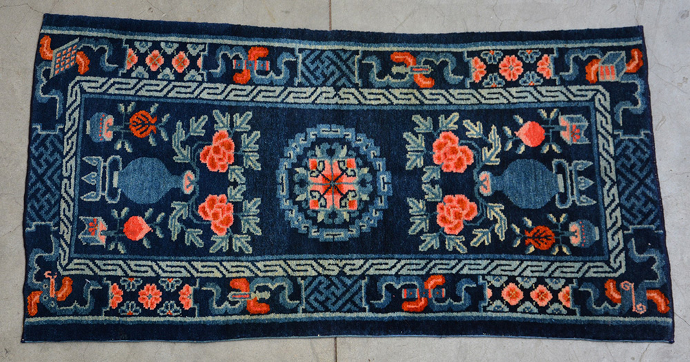 Tappeto cinese, secolo XX. Disegno a vasi fioriti su fondo blu (cm 118x62) (difetti)