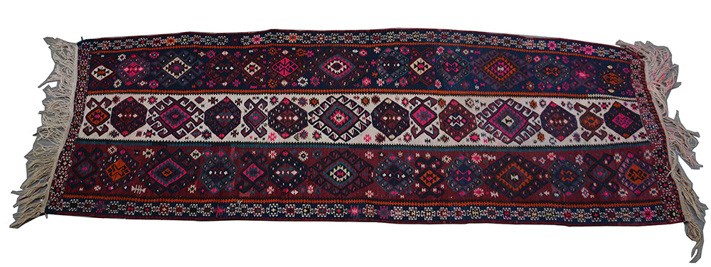 Kilim Anatolia secolo XX. Disegno geometrico con medaglioni policromi su fondo blu, bordeaux, bianco.(cm 314x113) (difetti)