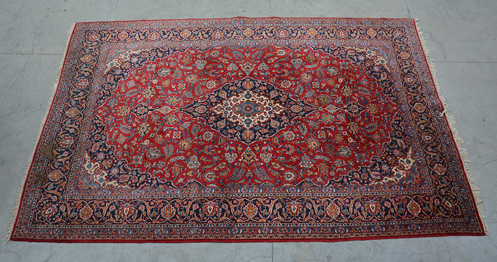 Lot 900 | Tappeto Keshan, Persia sec. XX. Disegno a medaglione blu su fondo rosso (cm...
