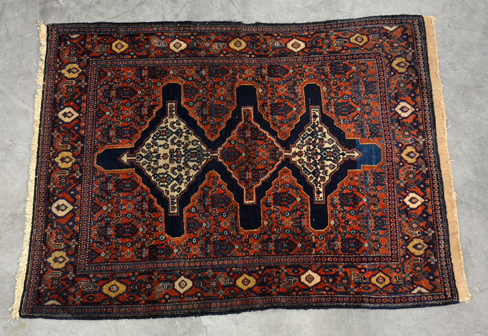 Tappeto Senneh, Persia fine secolo XIX. Disegno a tre medaglioni su fondo blu (cm 148x113) (difetti)