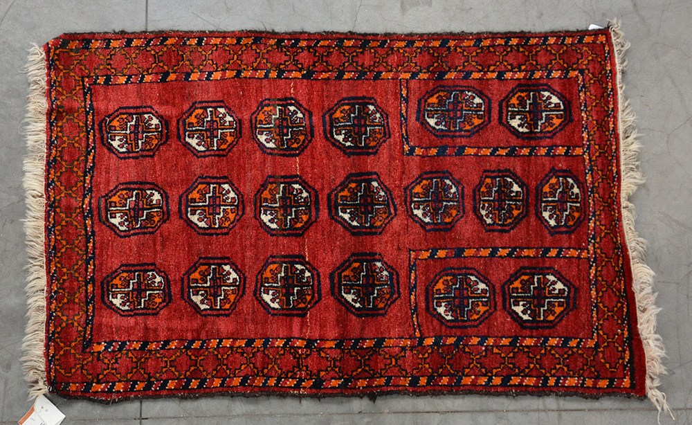 Tappeto Afghan, Turkestan occidentale secolo XX. Disegno a Gul su fondo rosso (cm 125x81) (difetti)