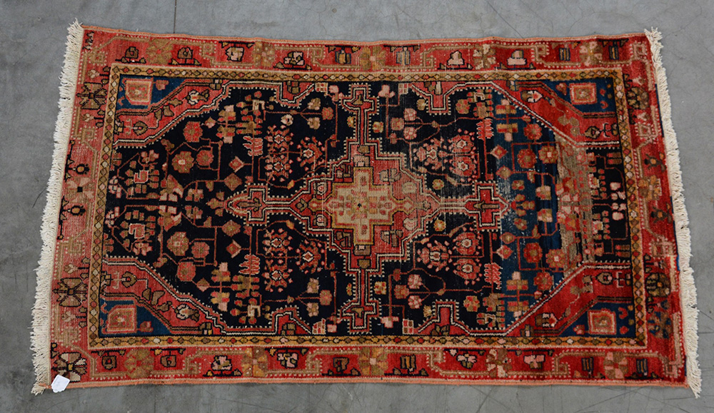 Tappeto Malayer, Persia secolo XX. Disegno a medaglione rosso su fondo blu (cm 186x110) (difetti)