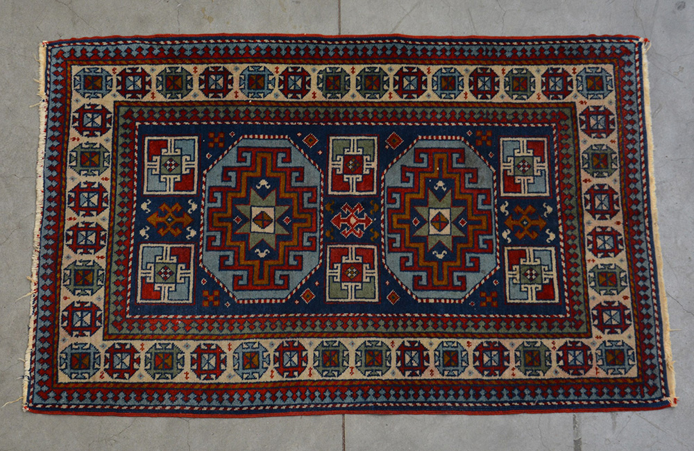 Tappeto caucasico moderno. Disegno con due medaglioni azzurri su fondo blu (cm 122x78) (disegno)