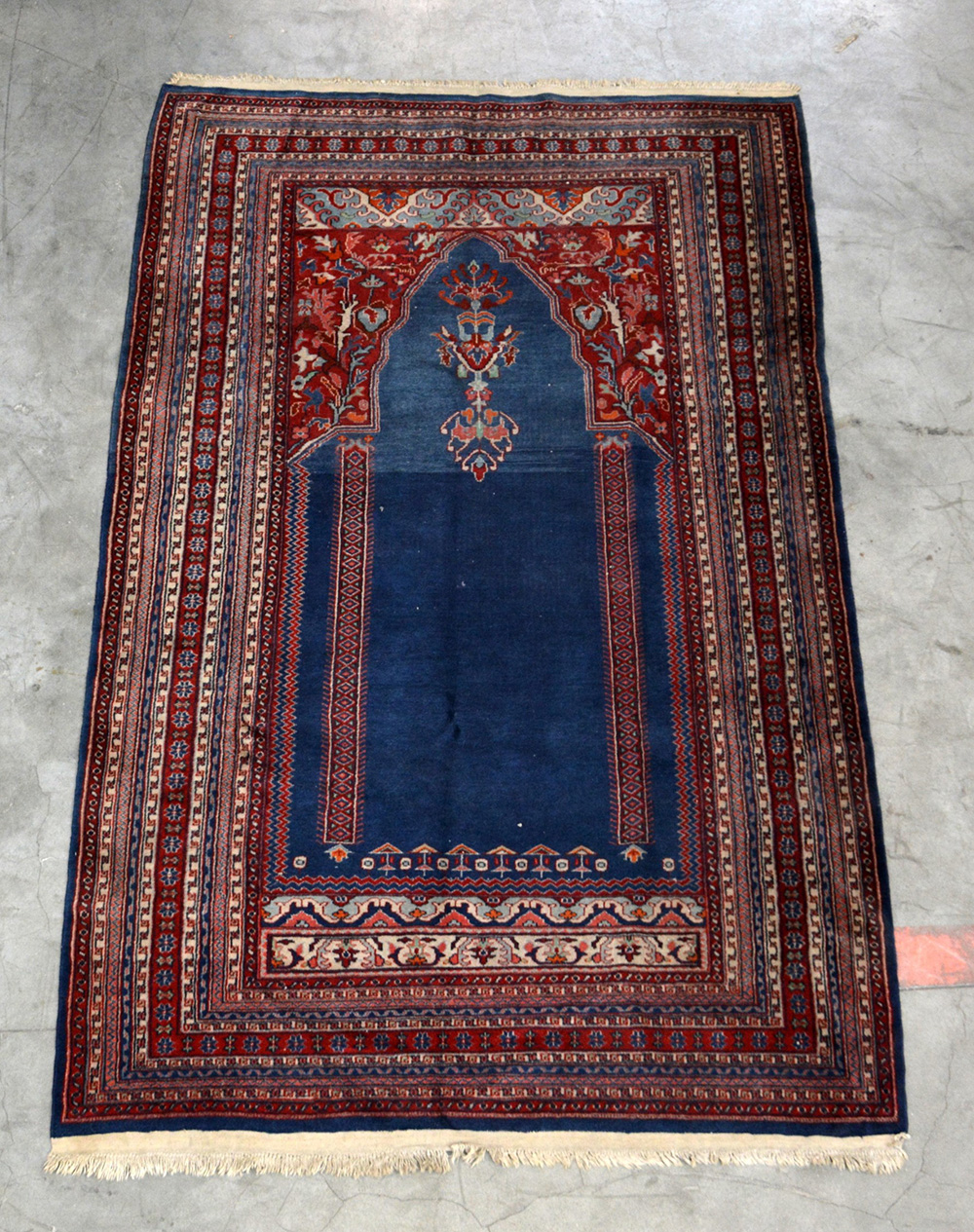 Tappeto da preghiera, India secolo XX. Mirab a fondo azzurro (cm 206x127) (difetti)