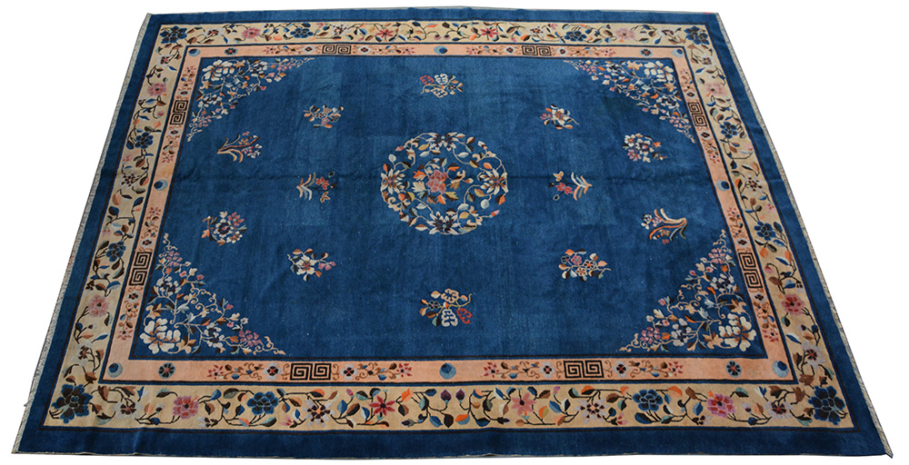 Tappeto Cina, Pechino inizio secolo XX. Disegno a medaglione e mazzi di fiori sparsi su fondo blu (cm 353x280) (difetti)