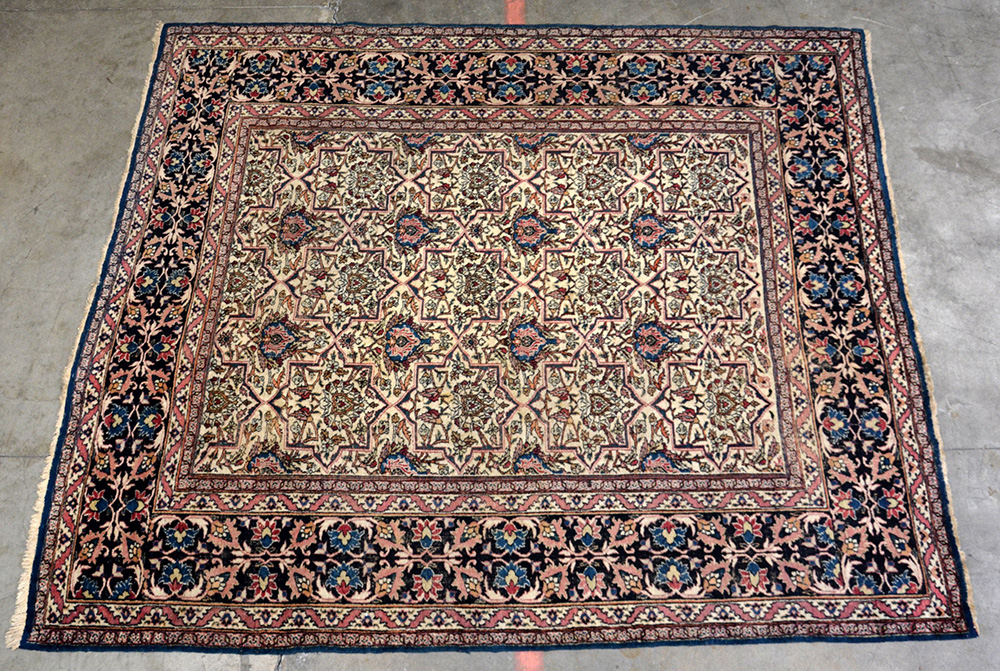Tappeto Khorassan, Persia inizio secolo XX. Disegno a griglia imperiale azzurra su fondo bianco (cm 267x232) (difetti)