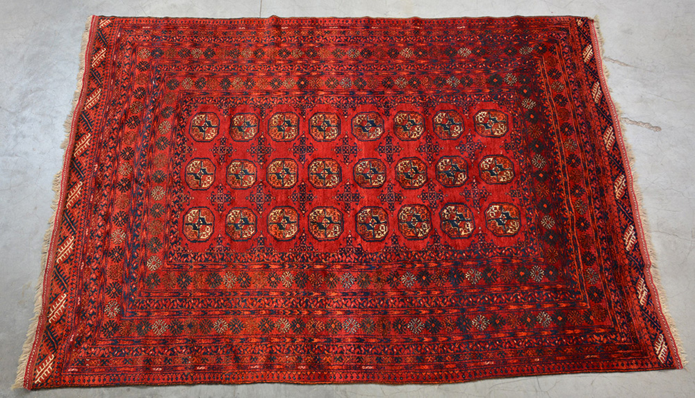 Tappeto Bhukara, Turkestan occidentale secolo XX. Disegno a Gul su fondo rosso (cm 303x224) (difetti)