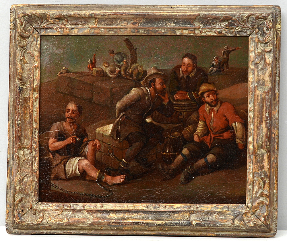 Antico dipinto raffigurante "Il riposo dei prigionieri", olio su tela (cm 23x28), in cornice antica (difetti)