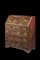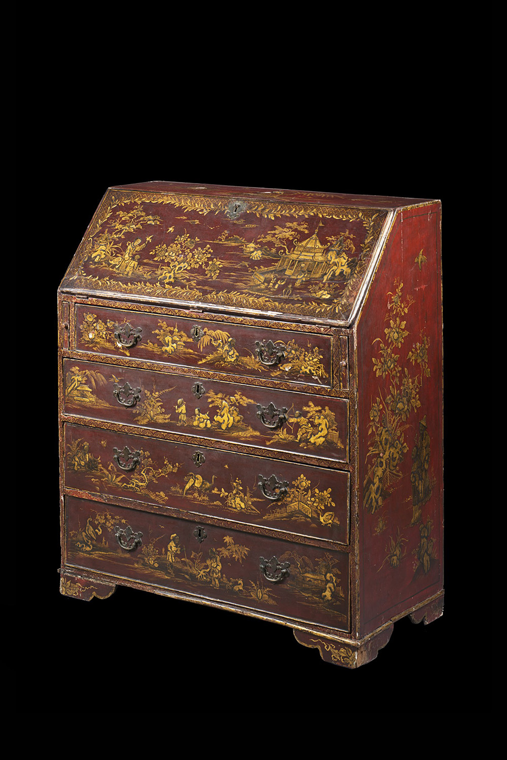 Ribalta laccata in rosso interamente decorata a cineserie in oro con fronte a quattro cassetti e antina ribaltabile celante vani e cassettini, tiretti estraibili, piedini sagomati. Inghilterra sec. XIX (cm 94x110x46) (difetti, mancanze e restauri)