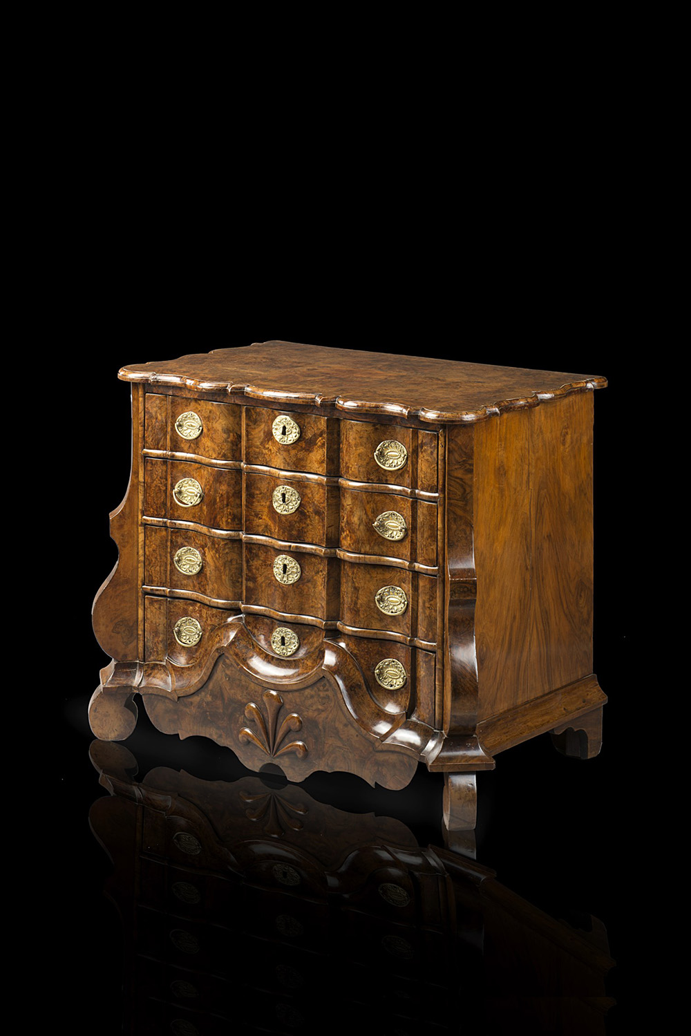 Comoncino di forma mossa lastronato in radica a tre cassetti piccoli sul fronte e uno grande nella base, montanti, fascia e piedi sagomati. Inghilterra, sec. XIX (cm 86x77x53)