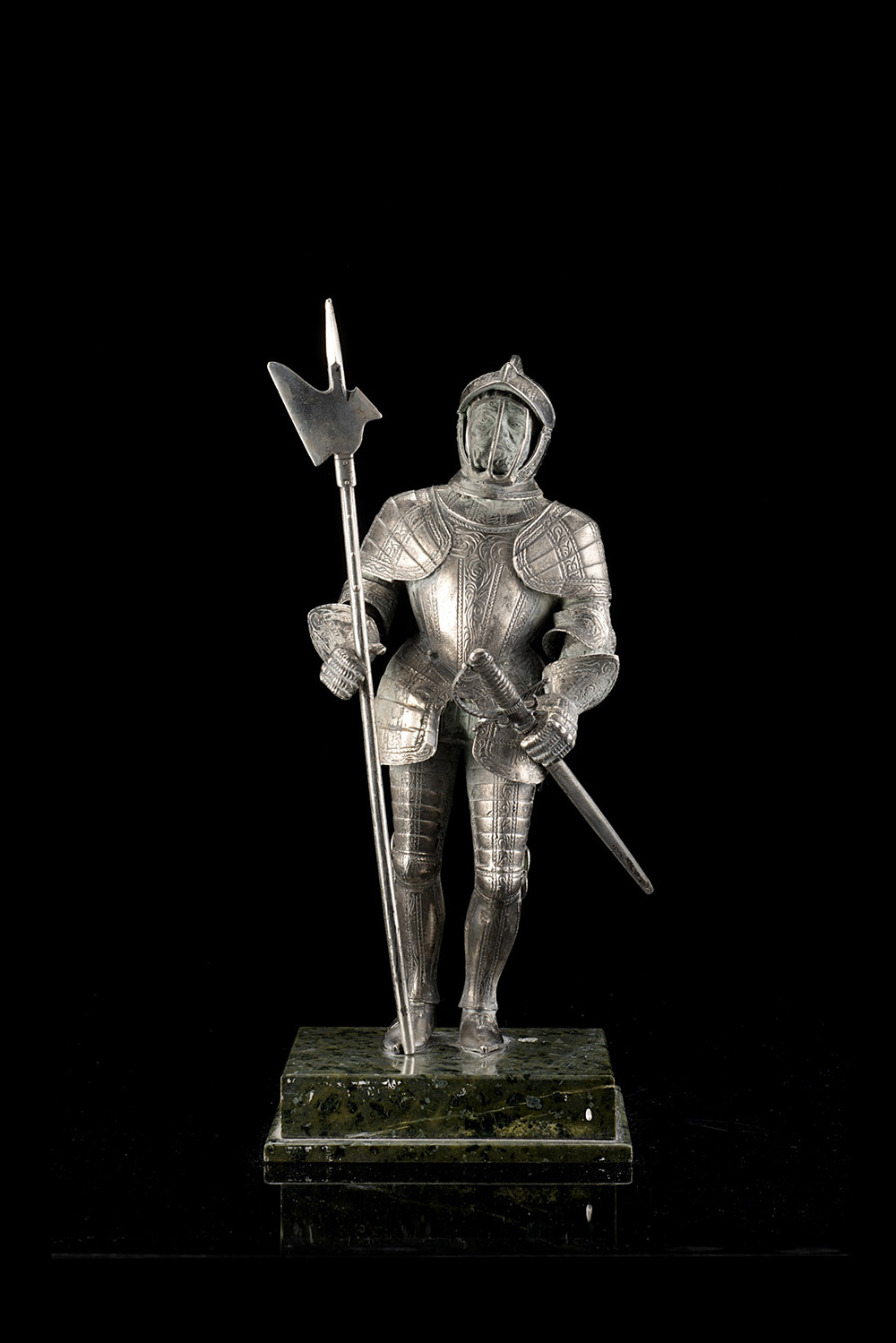 Scultura in argento raffigurante soldato in armatura e alabarda poggiante su...