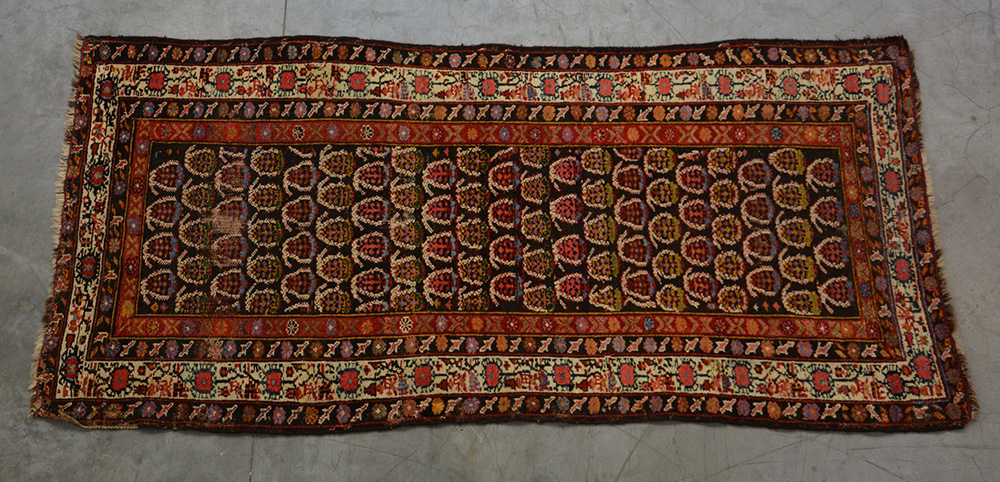 Tappeto GandjiË, Caucaso secolo XIX. Disegnoa file di Boteh policromi e floreali su fondo marrone scuro (cm 231x109) (difetti)