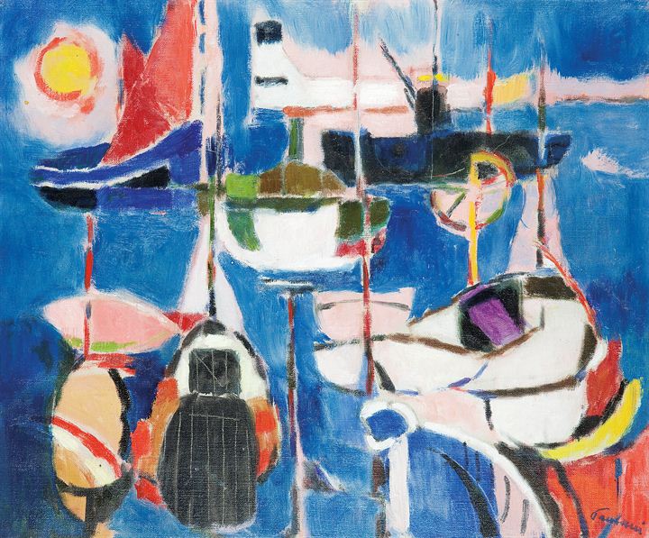 PAULUCCI ENRICO Genova 1901 - 1999 Torino "Porto blu" 1985 50x60 olio su tela...