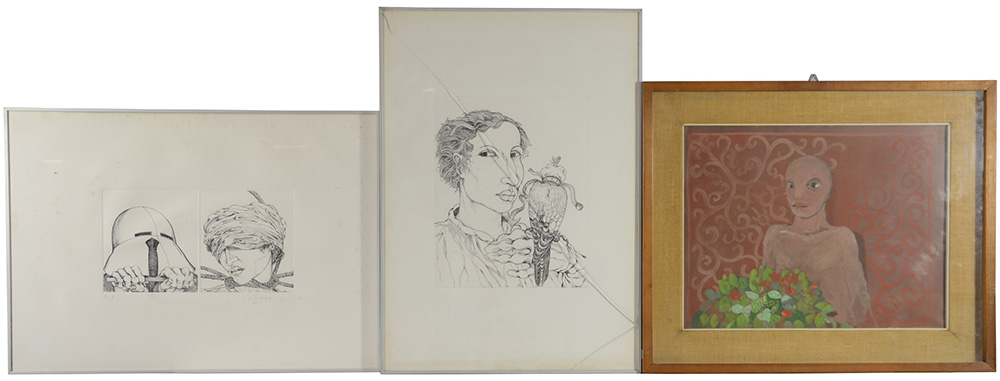 Gioxe De Micheli (Milano 1947) Lotto composto da un dipinto a tecnica mista su cartoncino (cm 42x54) e due acqueforti di misure diverse. In cornici (difetti)