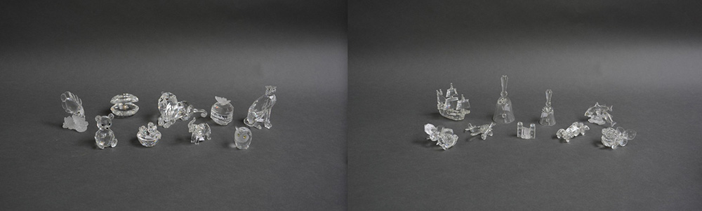 Lotto composto da diciotto sculturine in cristallo di diversa forma, alcune marcate Swaroski (difetti)