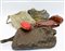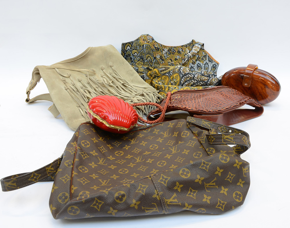 Lotto di due clutch, un marsupio e tre borse di colori materiali e dimensioni diverse (difetti, segni d'uso)