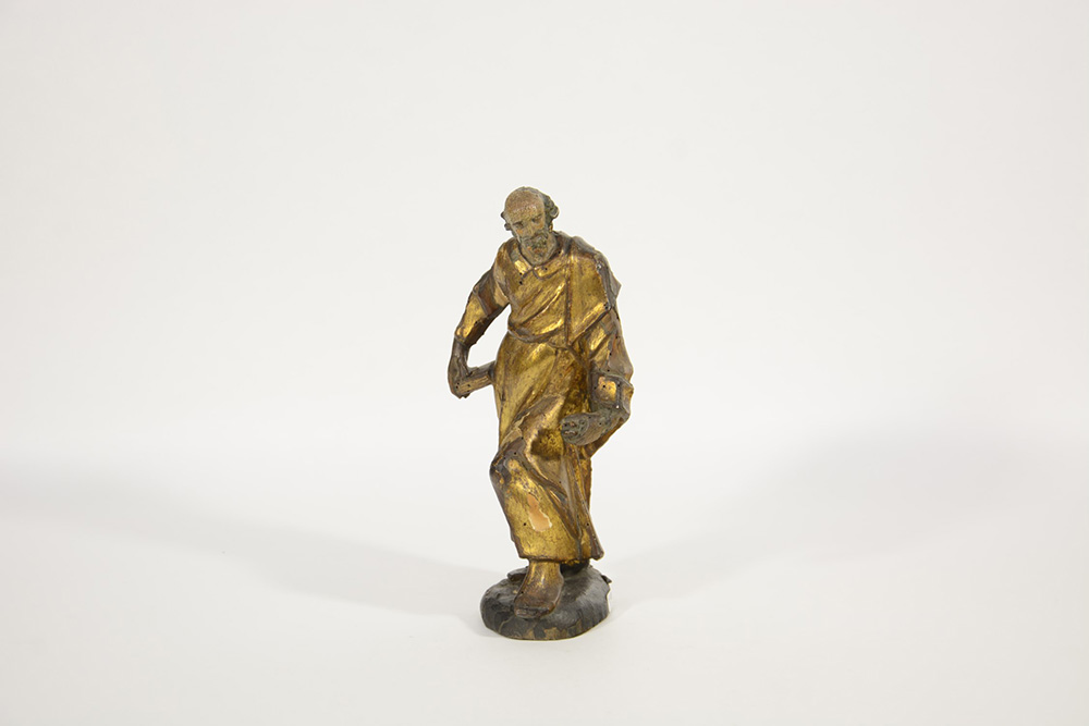 Arte popolare di inizio secolo XVIII, "San Matteo", scultura in legno intagliato e dorato con tracce di policromia sul capo (h cm 25) (difetti e mancanze)