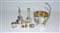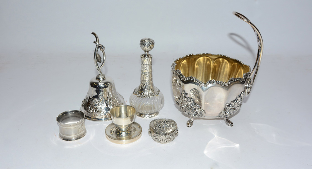 Lotto composto da un campanello in argento Paesi Bassi 1862 (cm 10xh. cm 16); una scatoletta a forma di cuore e decorata con amorini e motivi floreali, Germania sec. XX (cm 5,5), un portauovo in argento, un legatovaglioli, un flacone in vetro e argento e una ciotola con manico in metallo argentato (gr argento 200 ca.) (difetti)