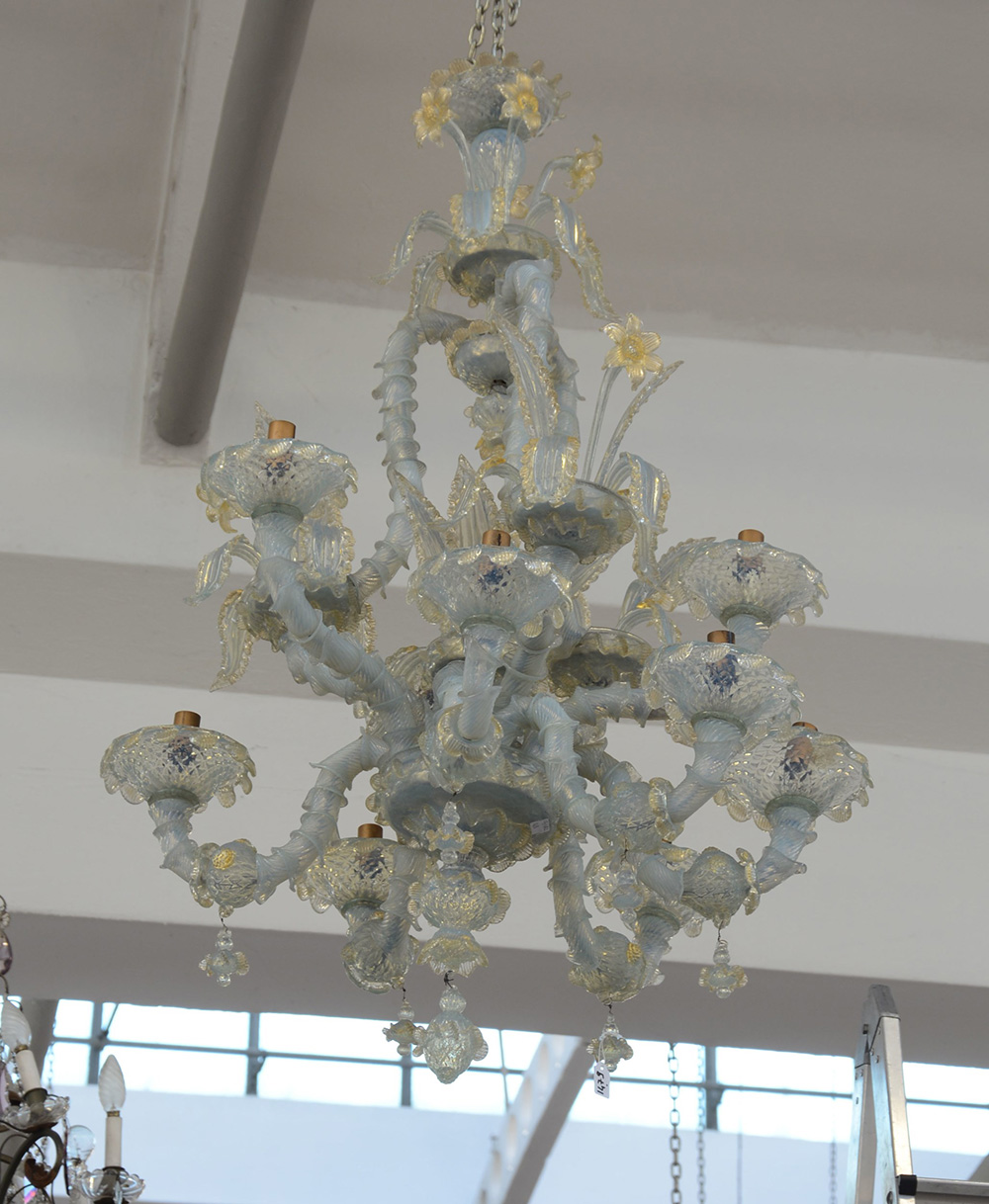 Manifattura di Murano. Lampadario a dieci luci disposte su due file in vetro azzurro decorato con applicazioni di foglia d'oro e pendagli. Sec XX (h. cm 120) (difetti)