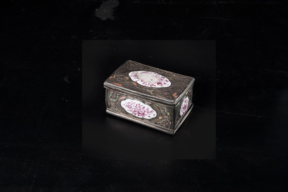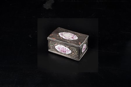 Scatola in argento con doppia apertura, incisa a motivi fogliacei, ogni lato con placche in porcellana a decori floreali, tracce di smalto. Antoine Daroux. Parigi, 1760 (cm 8x5,5x3,5)(difetti e mancanze)