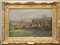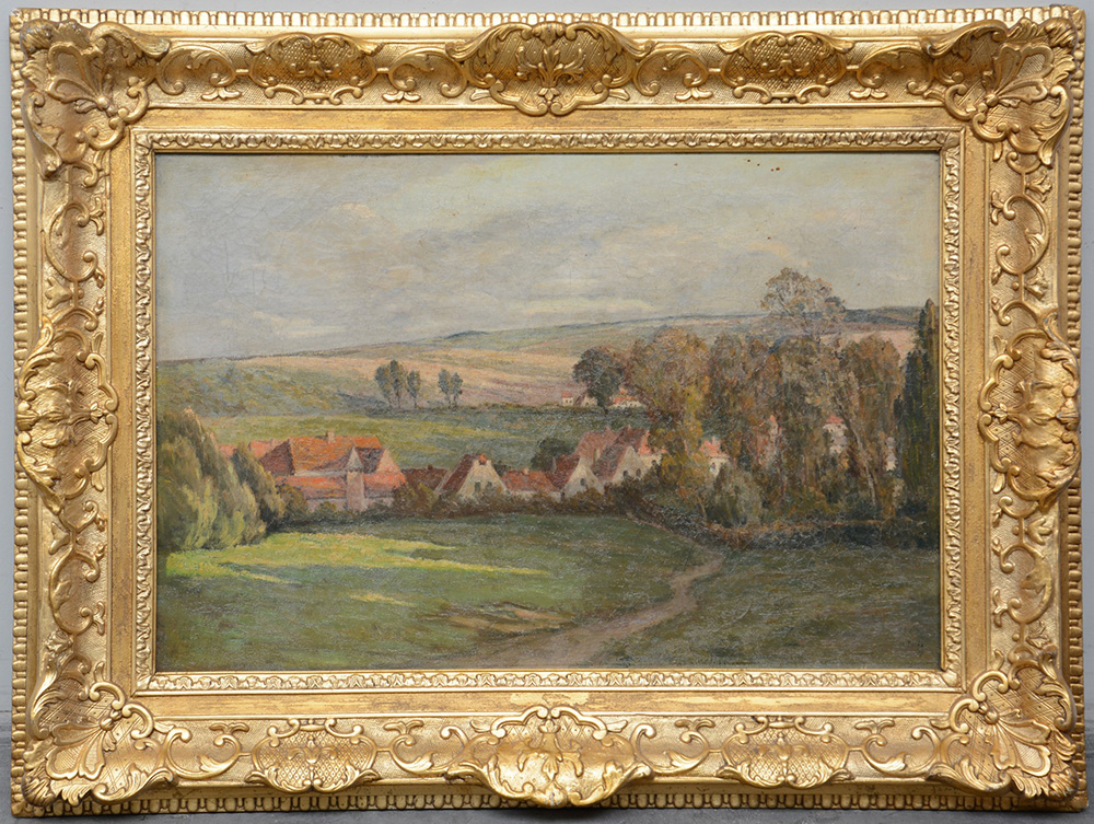 Firma indecifrata "Paesaggio con villaggio" olio su tela (cm 50x76) firmato in basso a destra . In cornice in legno e pastiglia dorata.
