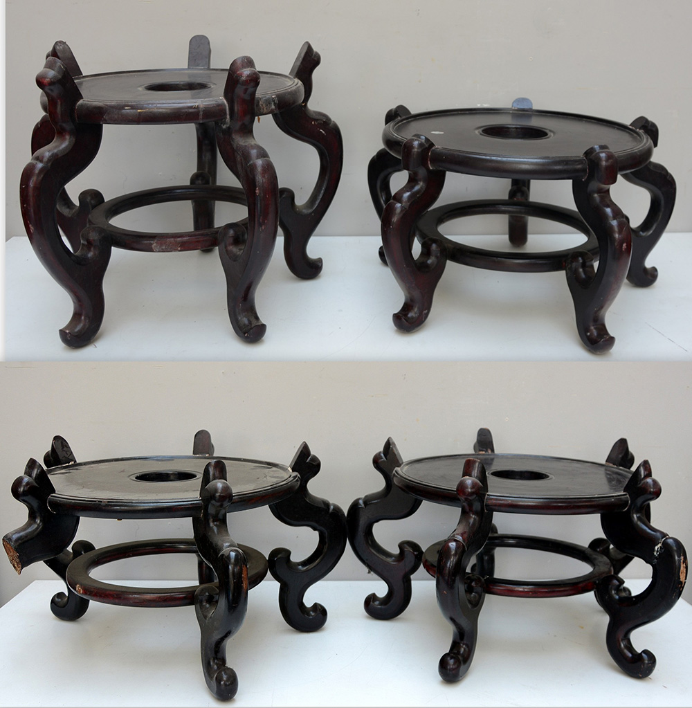 Lotto composto da quattro grandi basi porta cachepot orientali, in legno scuro (portata d cm 35, 38 e 40) (difetti)