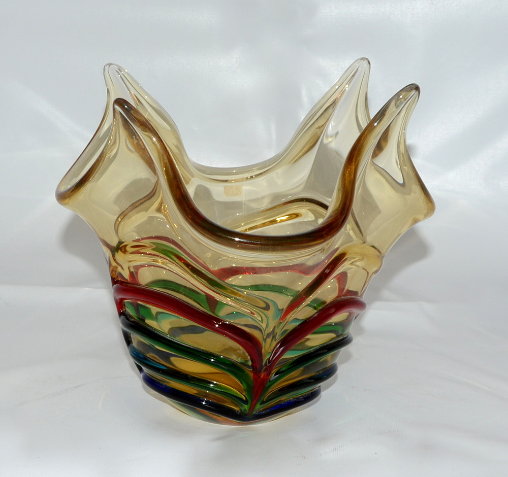 Manifattura di Murano, vaso di forma sagomata decorato con applicazioni policrome. Firmato Paolo Crepax sotto la base (h cm 24)