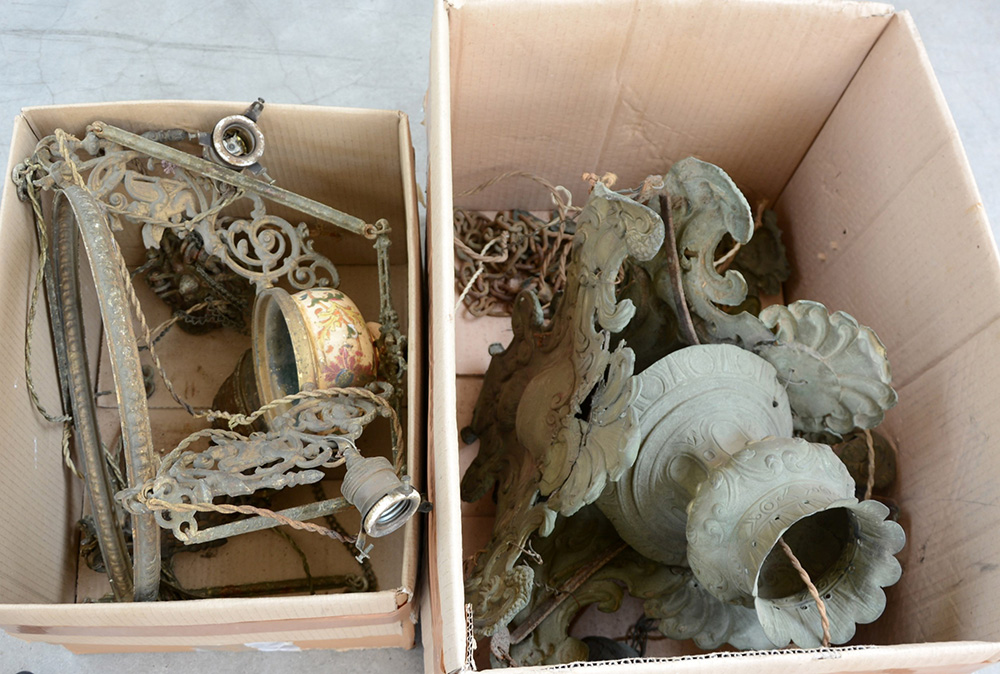 Lotto di due lampade a sospensione in ferro battuto e lamiera, inizio sec. XX (difetti e mancanze)