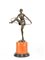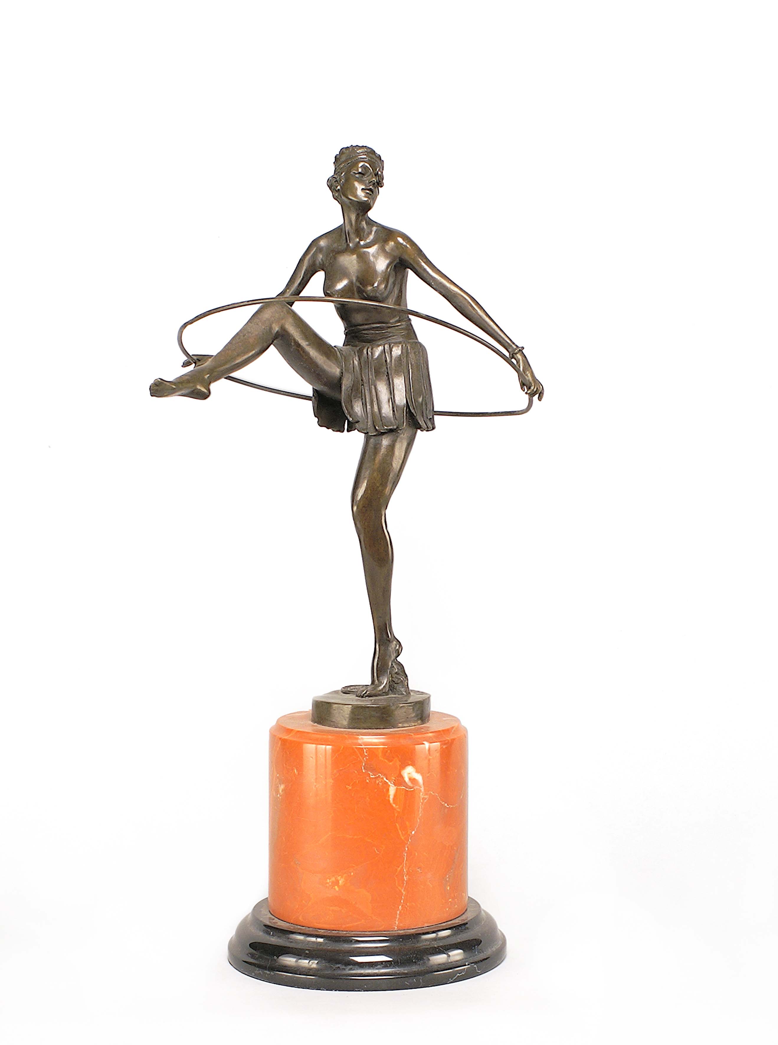 Scuola francese del XX secolo, gruppo in bronzo patinato raffigurante una ballerina con cerchio poggiante su base cilindrica in marmo, h. cm. 50.