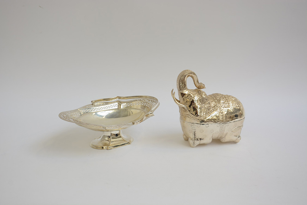 Lotto composto da una scatola a guisa di elefante e un centrotavola in metallo argentato