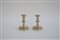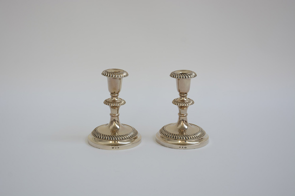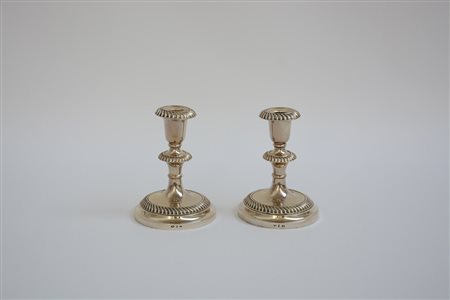 Coppia di candelieri in argento di forma circolare con fusto a rocchetto e cinture godronate. Italia, sec. XX (h. cm 14,5) (gr. 590 ca.) (lievi difetti)