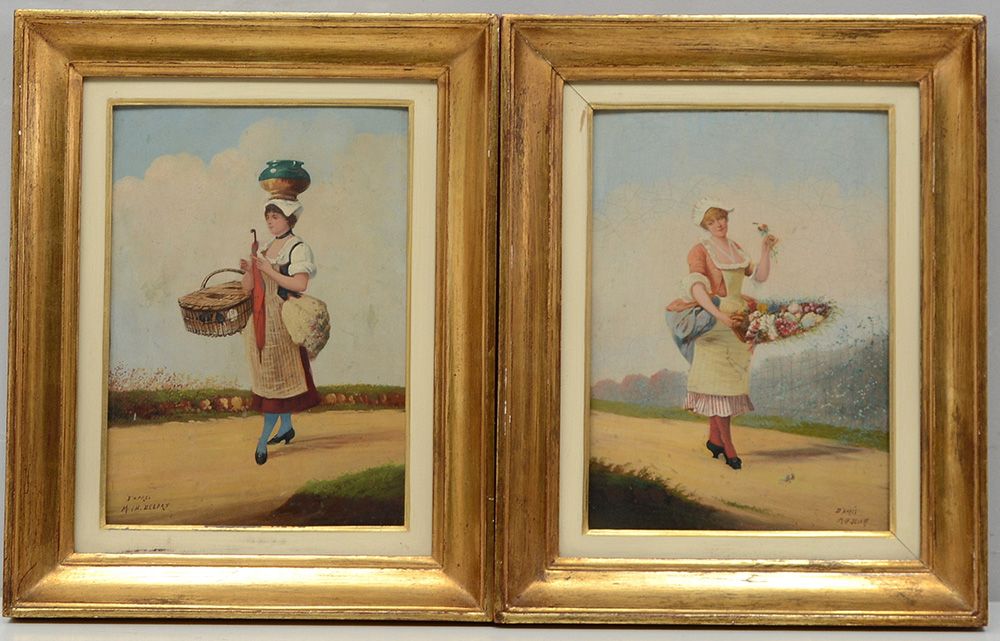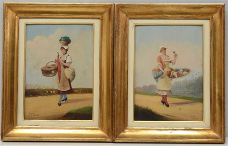 Lotto composto da due retouchË raffiguranti figure femminili in paesaggi (cm...