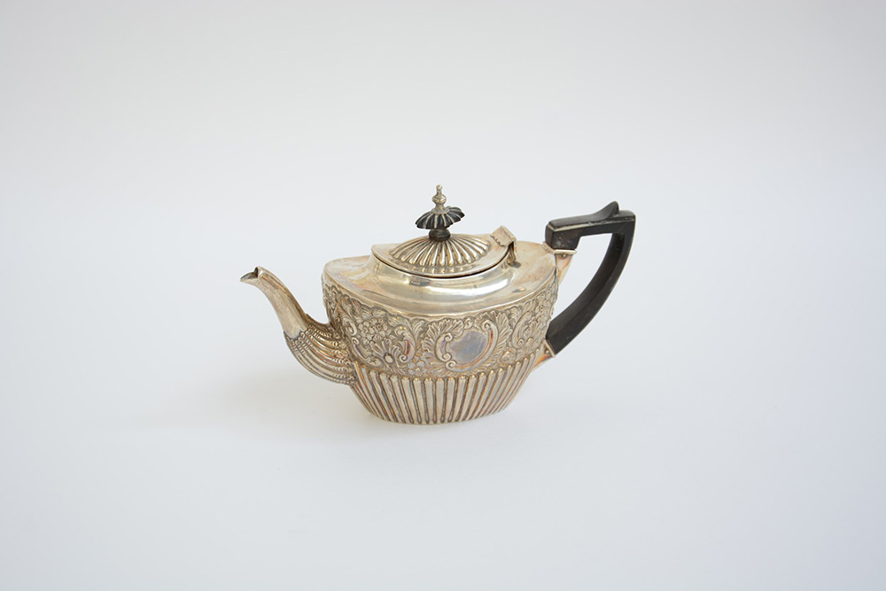 Caffettiera in argento di forma ovale decorata con parte inferiore del corpo a baccellature radiali e fascia superiore sbalzata a fiori e volute fogliate. Manico ad ansa squadrata in legno. Birmingham, 1890 (gr. 230) (difetti)