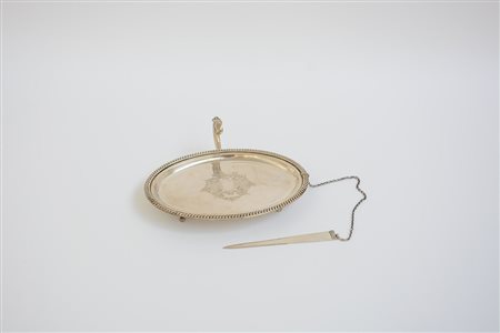 Vassoietto in argento con tagliacarte di forma ovale con bordura godronata e...