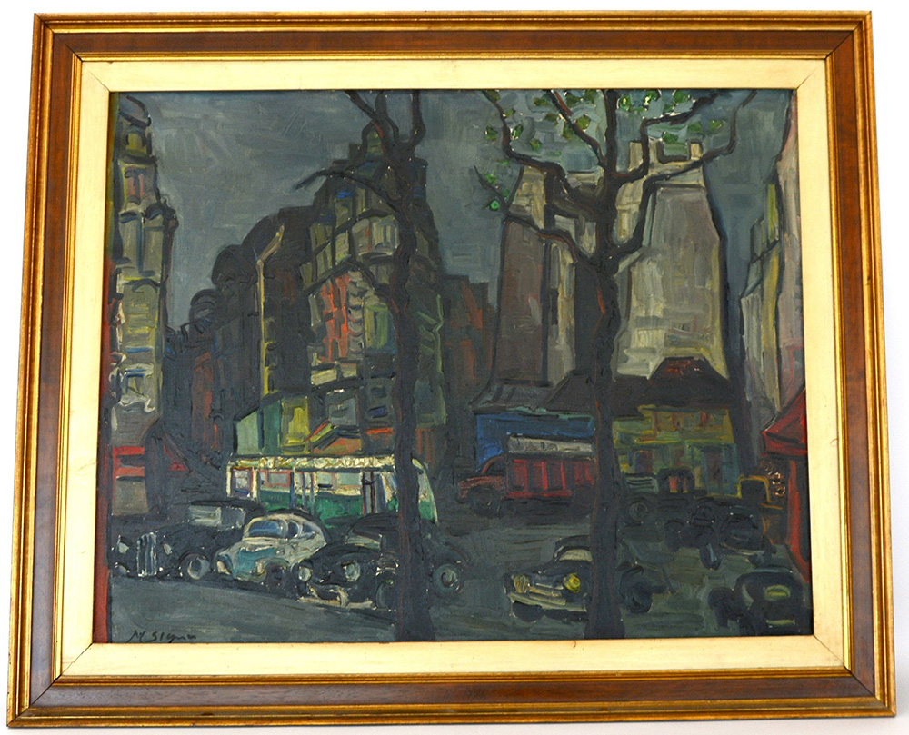 Firma indecifrata "Scorcio di citt‡" olio su tela (cm 64x80) Firmato in basso a sinitra. In cornice (difetti)